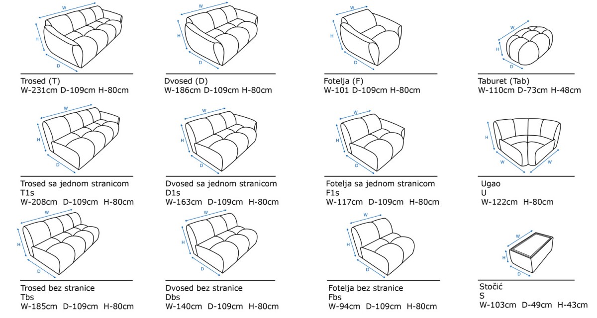 Opciona leva i desna, mehanizam u trosedu i kutija za posteljinu u meridijanu.