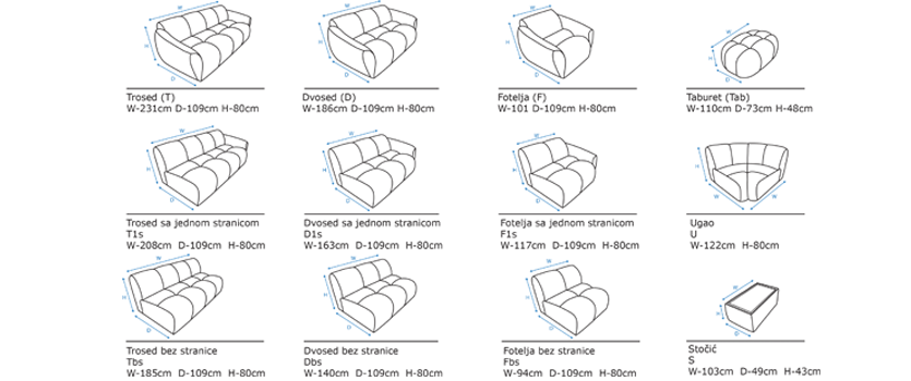 Opciona leva i desna, mehanizam u trosedu i kutija za posteljinu u meridijanu.